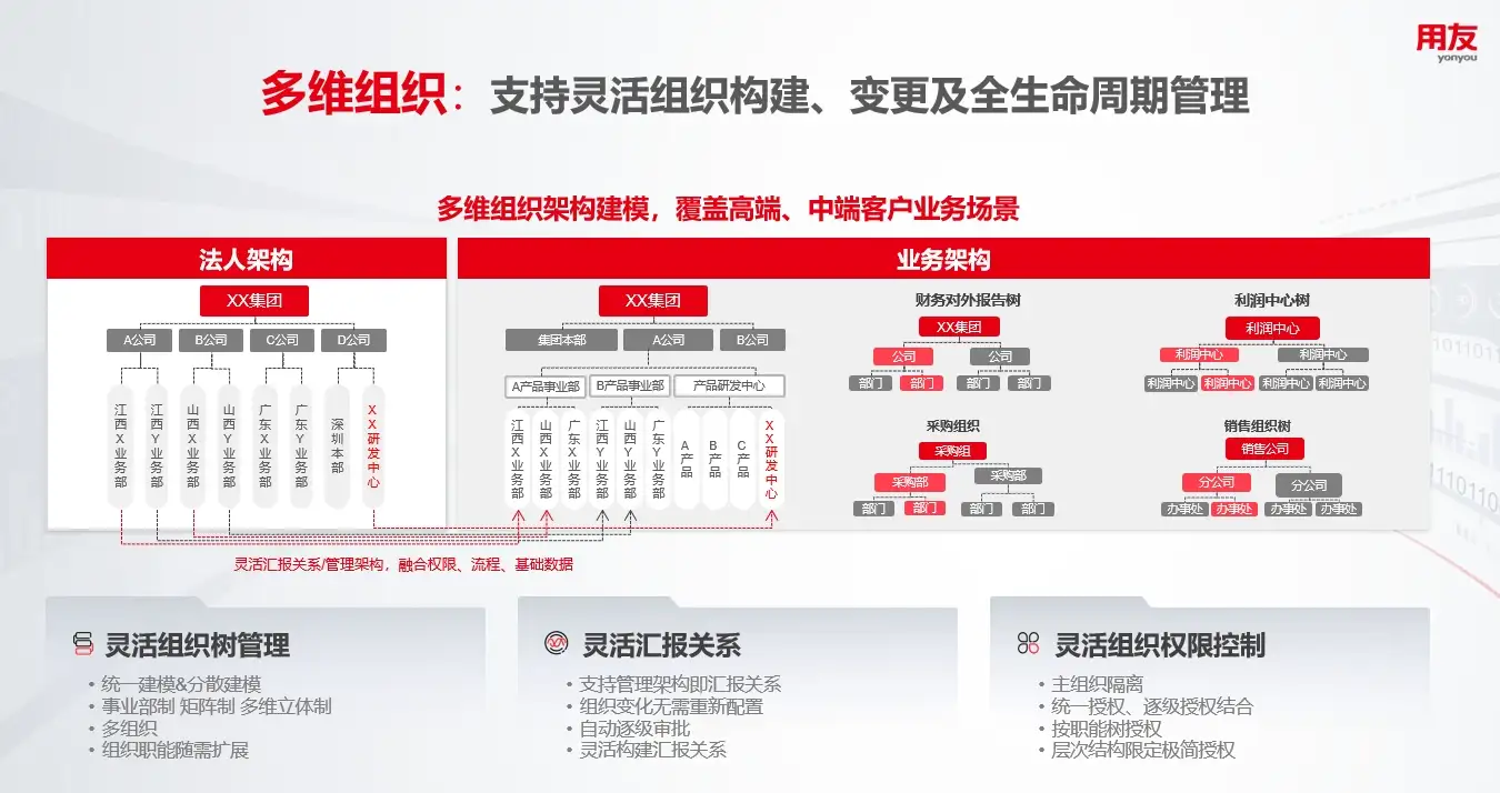 用友BIP提供了灵活的多维组织能力,从纵向组织架构维度,多维组织树帮助企业协调刚性组织架构和组织灵动性需求的矛盾,与权限和流程等融合,提高企业围绕业务的组织变化能力;从横向时间维度,支持基于时间轴进行组织创建、变更,追溯过去、模拟未来,帮助企业全面掌握组织、人员现状及变化趋势,为各类人力资源管理和企业经营决策提供有力支撑。