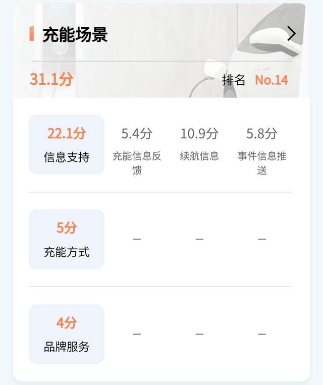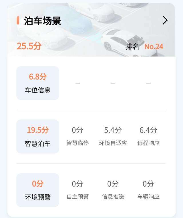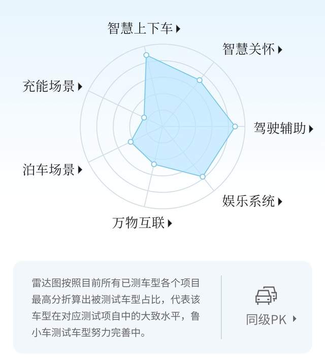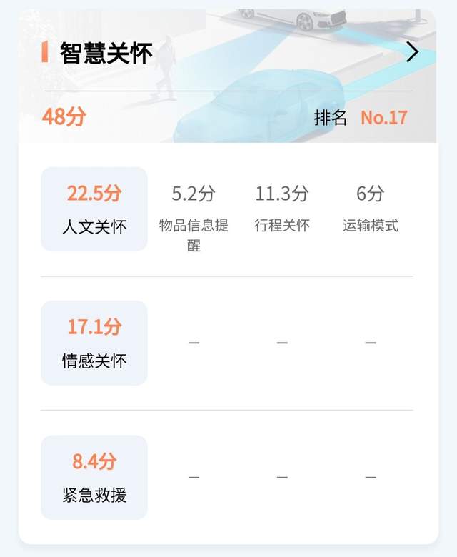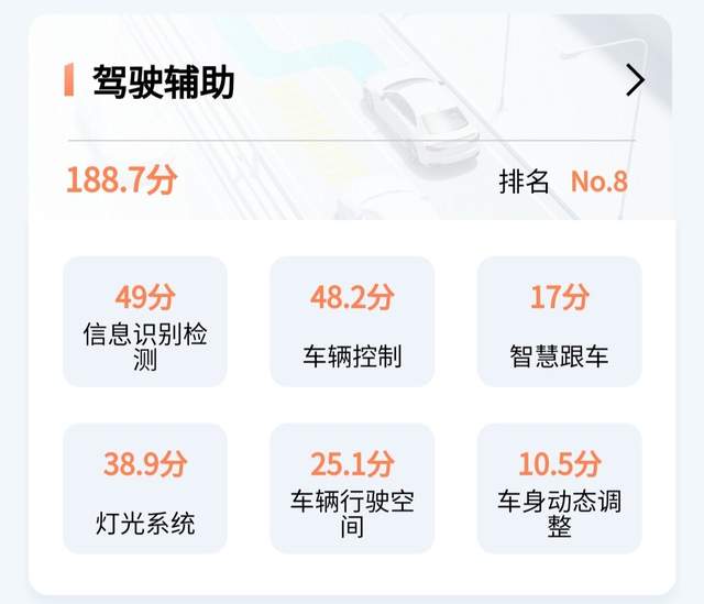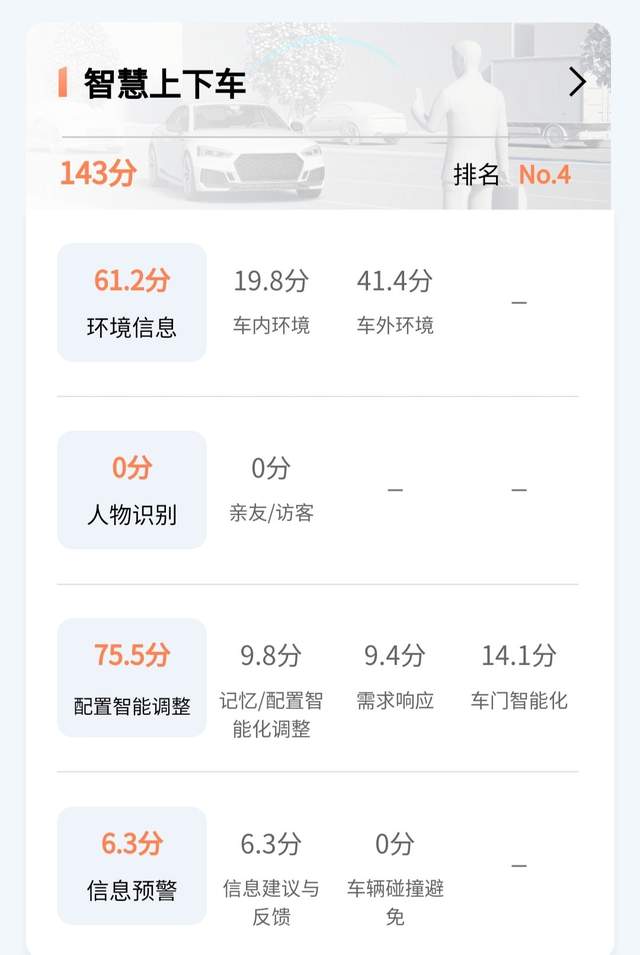 分散到七个项目上的评分分别是,智慧上下车143分、驾驶辅助188.7分、娱乐系统50.3分、万物互联34.1分、泊车场景25.5分、充能场景31.1分、智慧关怀48分。