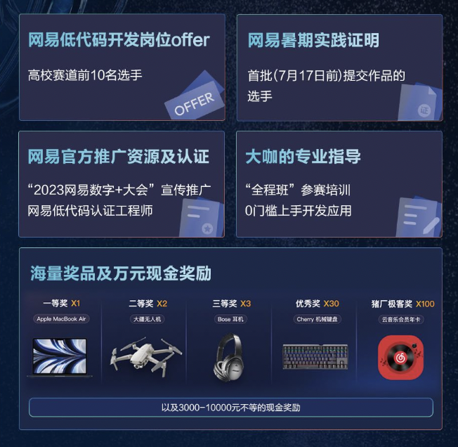 高校赛道的优胜者将获得Apple MacBook Air、大疆无人机、Cherry 机械键盘、HUAWEI 智能音箱或“猪厂”极客奖云音乐会员年卡等奖品。首批(7月17日前)提交完整作品的选手还可获得网易暑期实践证明,最终成绩前十名的选手还可获得网易工作机会,成为一名职业低代码开发者。
