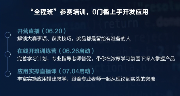 为更好的帮助选手快速入门,比赛还设立了全程班,从0-1的理论到实践教学,包括开营直播课、在线开班训练营、应用实操直播课等各阶段课程,带领选手从入门到精通,最终独立完成软件开发。