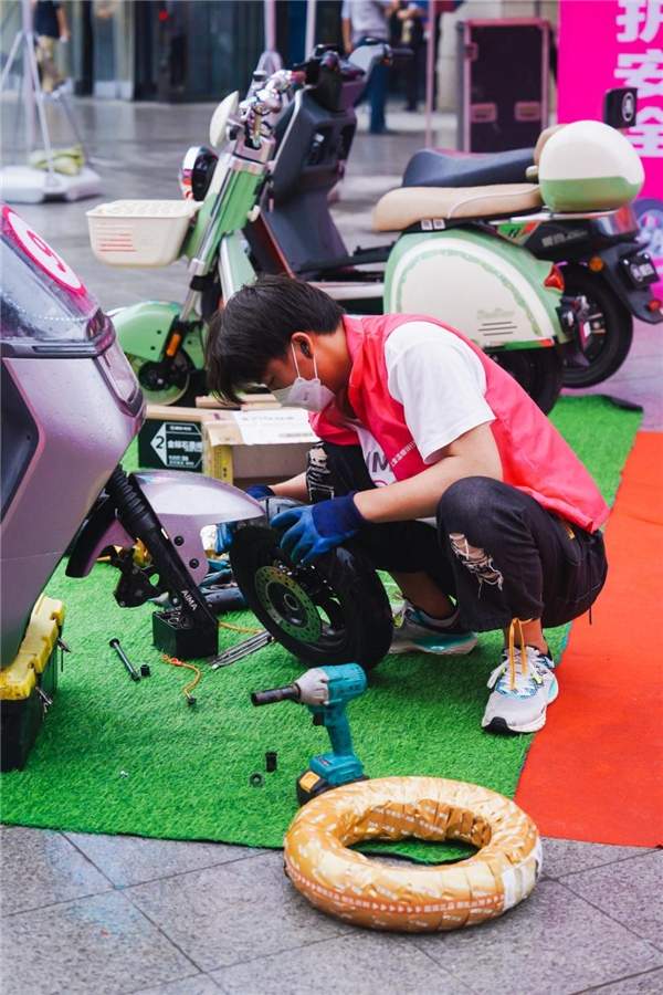 图:爱玛车服“轮胎节”活动中,工作人员为用户提供轮胎相关服务