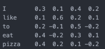 例如, "I like to eat pizza" 这句话,在我们人类的眼中极为简单,但在计算机眼中,它会被解构成每一个单词对应的向量。如下: