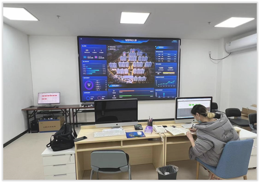 在调度指挥中心的智慧养老大屏上,实时滚动显示老人家中的设备状态、报警信息及老人健康状况。当出现异常告警信息,调度指挥中心就会即时收到提示,工作人员同步响应,采取电话询问、到家探视等措施。