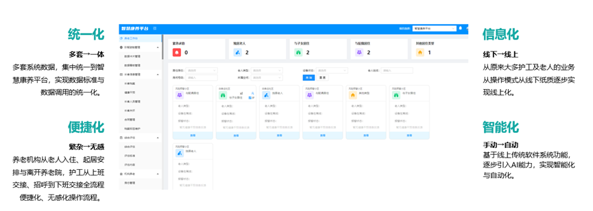 通过大模型、智能语音、AIoT、语义理解、知识图谱、多模态等技术赋能,提供长者状态面板、长者异常提醒、长者档案管理、长者健康干预、长者心理照护、适老紧急呼救、风险预案管理、家属信息服务、智能回访系统、智慧康养平台等10大应用场景的解决方案,从安全、养护、健康、环境智慧化等多角度赋能智慧康养服务。
