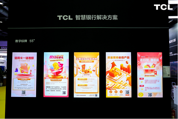 在智慧金融方案中,TCL针对银行网点向数字化、智慧化方向转型的需求,通过TCL数字标牌搭配自研的信发、集控平台,在展示金融产品信息时,可以实现精准化数字营销。还可结合NXTHUB智能交互大屏对设备UI进行定制化,根据银行自身业务规划、金融生态等,打造主题特色的业务场景。