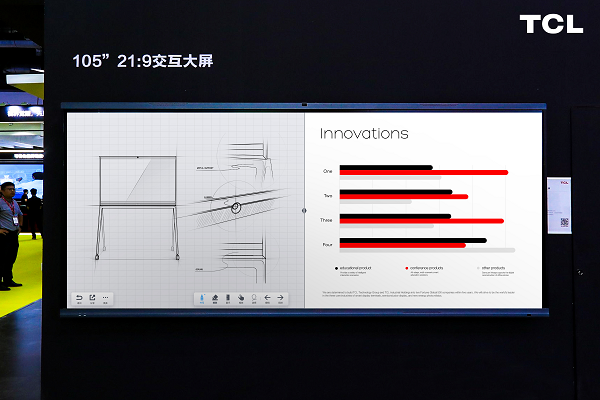 本次展会TCL商用还展出了105"智慧交互宽屏,拥有超高对比度、超宽显示比例、超细腻真实画质等显示性能,兼具触控功能等特性,为会议、教育等场景客户带来更多产品形态选择,和更加真实、清晰的视觉体验。特殊的21:9显示比例,比传统16:9屏幕空间多出了33%。105″巨幕带来全新体验,更适合分屏应用,让会议协作性更高;5K高分辨率画质,超清显示让细节栩栩如生。