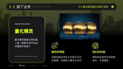 量化精灵智能交易机器人由区块链资深技术团队研发、量化精灵集结在行业8年+的技术开发精英、区块链行业分析师、区块链创业者共同打造,钻研、实验智能交易技术达到4年之久,计划三年内在AI智能交易领域获得领军地位。