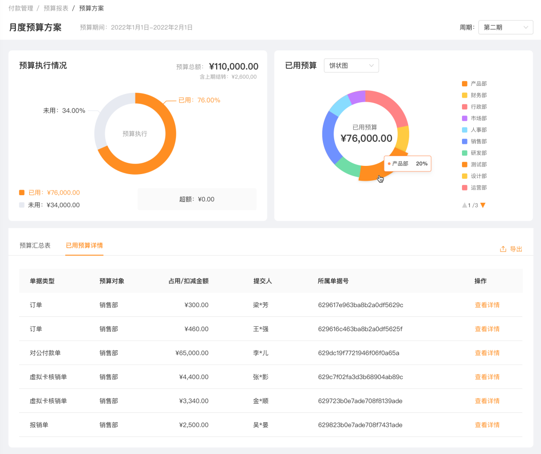 分贝通5.0版本支持全面预算管理,事前预算可编,事中预算可控,事后预算可分析可下钻,一个平台全搞定,预算落地不再困难。同时,为了帮助财务进一步精细化预算管理,分贝通还支持全场景(如机票、酒店等)、多维度(支持部门、项目、个人)的灵活配置,如需预算调整可直接在线完成,并留痕便于日程跟踪。