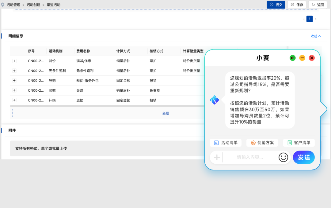 AI赋能活动效果分析。私域报告的生成与解读,结合大数据对生意进行分析与解读,生成报告。“在企业数据资产化之后,经过大模型训练,系统能够快速给业务人员对应的分析报告。解决了过往业务人员需要通过IT才能获取到相关数据的困境。同时,AI还能够将过去一年、半年所有活动汇总做专题研究,智能生成报告解读,指导未来销售策略,辅助决策层洞察每笔营销费用,敏捷快速作出针对性运营决策。 ”