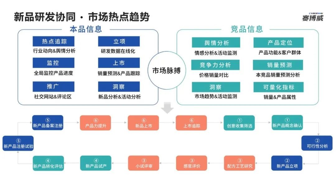 赛博威新品研发协同平台目前已经助力众多头部快消企业在新品研发过程中,洞察市场趋势,找准新品方向,规范化新品研发流程,提高新品研发效率,实施新品上市追踪,把握市场脉搏,抢占市场份额。