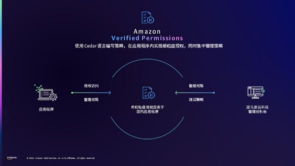 针对应用的安全访问,企业可构建零信任的应用安全访问策略。亚马逊云科技日前推出了 Amazon Verified Permissions,为用户构建的应用程序提供细粒度授权和权限管理,用户可以使用该服务管理其应用程序的角色和属性的访问控制。