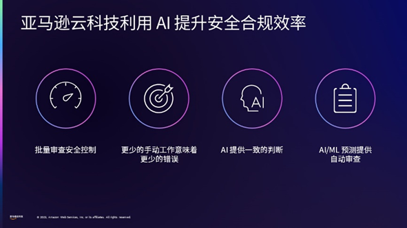 亚马逊云科技通过在其500多项自身合规审计控制项中使用 AI 技术,大幅提升了自身的合规效率,将审计时间节约了53%。亚马逊云科技在保护客户的合规、安全的同时,也在积极地使用人工智能技术提供自身的合规能力。此外,亚马逊云科技 APN 合作伙伴网络提供了数百种行业领先的安全解决方案,以多层保护的方式来保障客户的应用和数据安全。