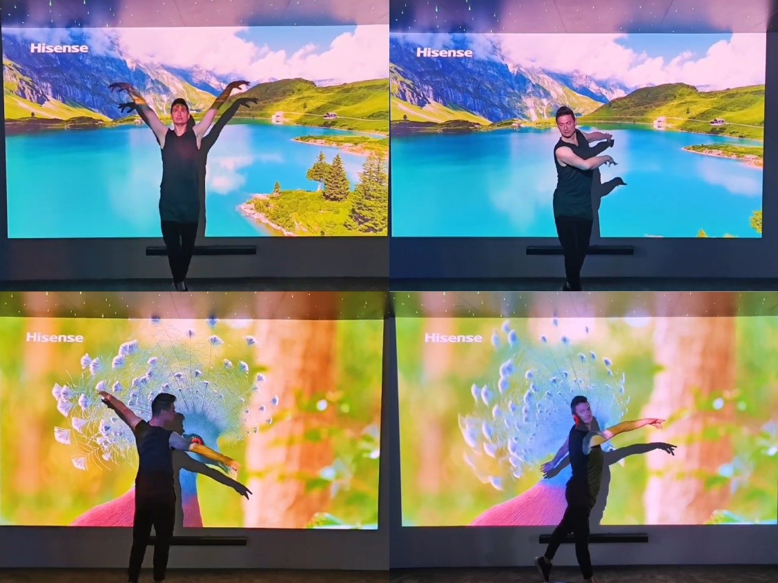 IFA现场,海信全球首款8K激光电视、200吋融合屏等全百吋+巨幕显示阵容引发海外观众频频驻足。现场更有国际艺术家,被激光投射出的巨幕观影效果震撼,自发在色彩真实纯净的山水画卷前翩翩起舞,吸引众多国际参展者围观。