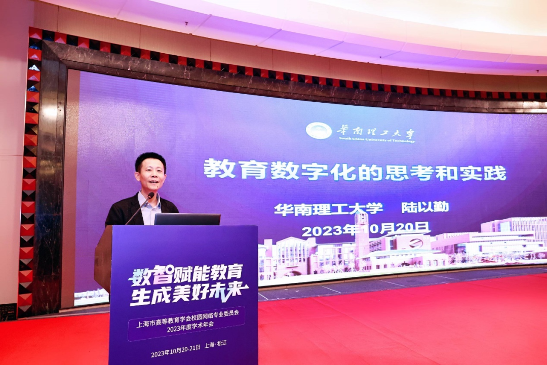 党和国家高度重视教育数字化,推进全民终身学习的学习型社会。当前,数字技术与教育深度融合发展,高校信息化建设步入教育数字化转型的重要时期。会上,华南理工大学副CIO陆以勤作了“教育数字化的思考和实践”学术报告。他指出,华南理工大学以教育数字化驱动大学治理和“双一流”建设,围绕服务师生为中心,运用人工智能、5G、大数据、云计算、物联网、区块链、隐私计算、高性能计算、微服务架构等前沿技术,构建一个具备“全面感知、深度融合、多维服务”的“智慧华园”校园环境,探索在地国际化办学模式,提高学校在大学治理、教学、科研、社会服务的核心竞争力。