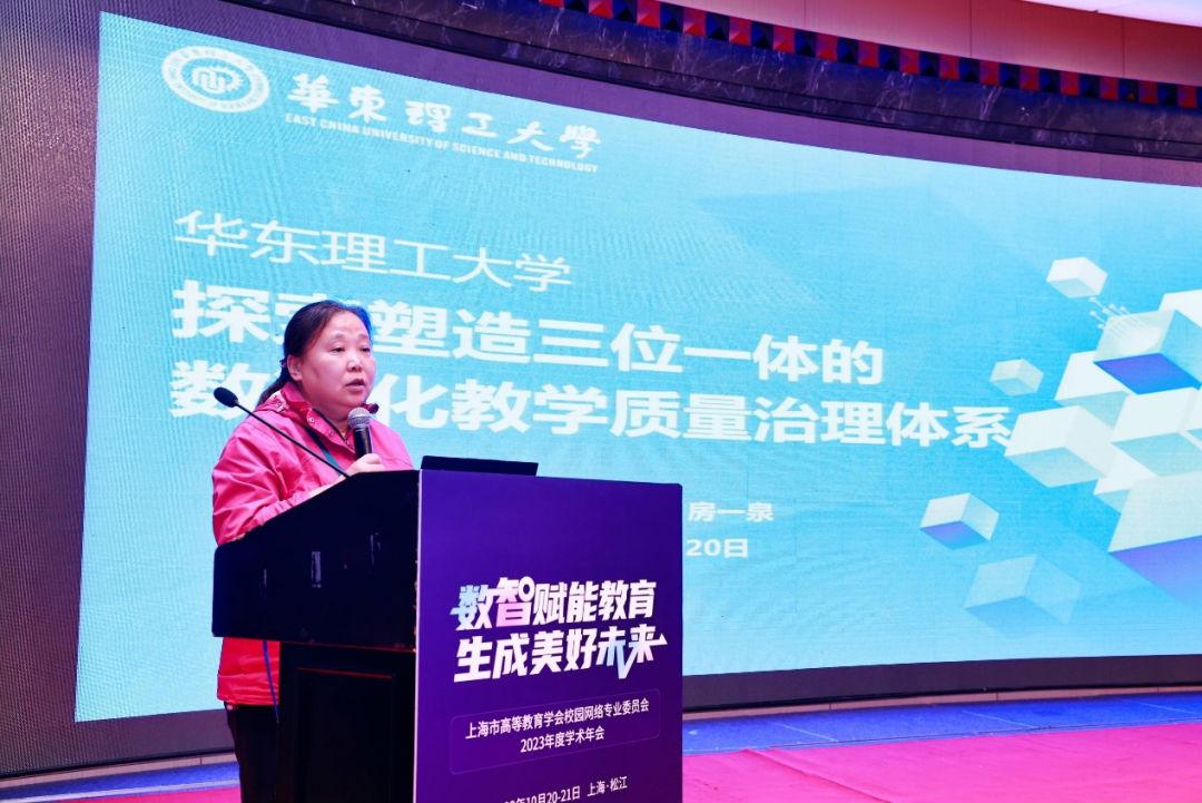 华东理工大学信息化办公室副主任房一泉分享了华东理工大学在“探索塑造三位一体的数智化教学质量治理体系”的实践经验。她认为,高校数智化教学质量治理体系要以数据为基础,以场景为载体,以智能为手段,以应用为目的,以人文为关怀,以学生为中心。要把数据的集成,数据的计算,数据的治理,数据的归集进行互融互通,共建共享。通过构建“数知+数智+数治”和“场景+技术+方法”的全新体系,落实“三位一体人才培养方案”,实现高校教育教学高质量发展。