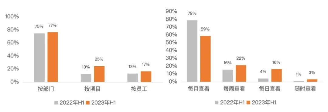 疫情后企业普遍表示“管更严”成为趋势,多维度、高频度、快捷查看等成为费用管理趋势。调研发现,相比于2022年今年上半年按部门、项目、员工各维度关注度都有明显提升,其中按员工进行费用管控占比从13.3%提升到16.7%,以周、日为单位查看费用频率也有显著增加。