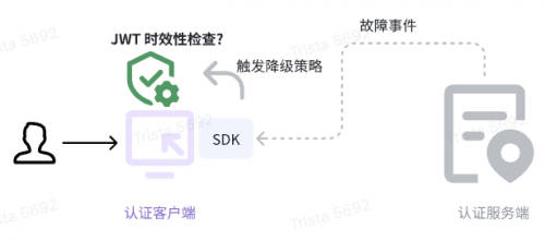 在本案例中,为了能让系统正常运行,将会牺牲较小部分的安全性。其中一种实现方式为:在接收到“故障”事件后,通过忽略本地缓存的认证 Token 的过期时间,持续提供认证能力;待收到“故障恢复”的事件后,再恢复到常规的更安全的认证方式上,即重新申请 Token 并验证 Token 的过期时间。