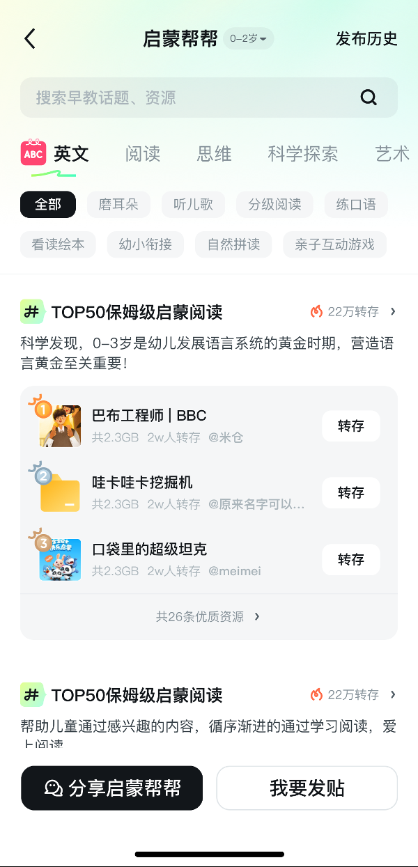 启蒙帮帮早教社区。启蒙帮帮是0-6岁幼儿启蒙经验的分享论坛。家长们可以在这里讨论、分享自己的宝藏资源,也可以将其他家长分享的宝藏经验一键转存家庭文件夹。资源存储在家庭文件夹,方便与家人共享,家庭成员之间还能同步了解孩子的学习进度,共同陪伴孩子成长。