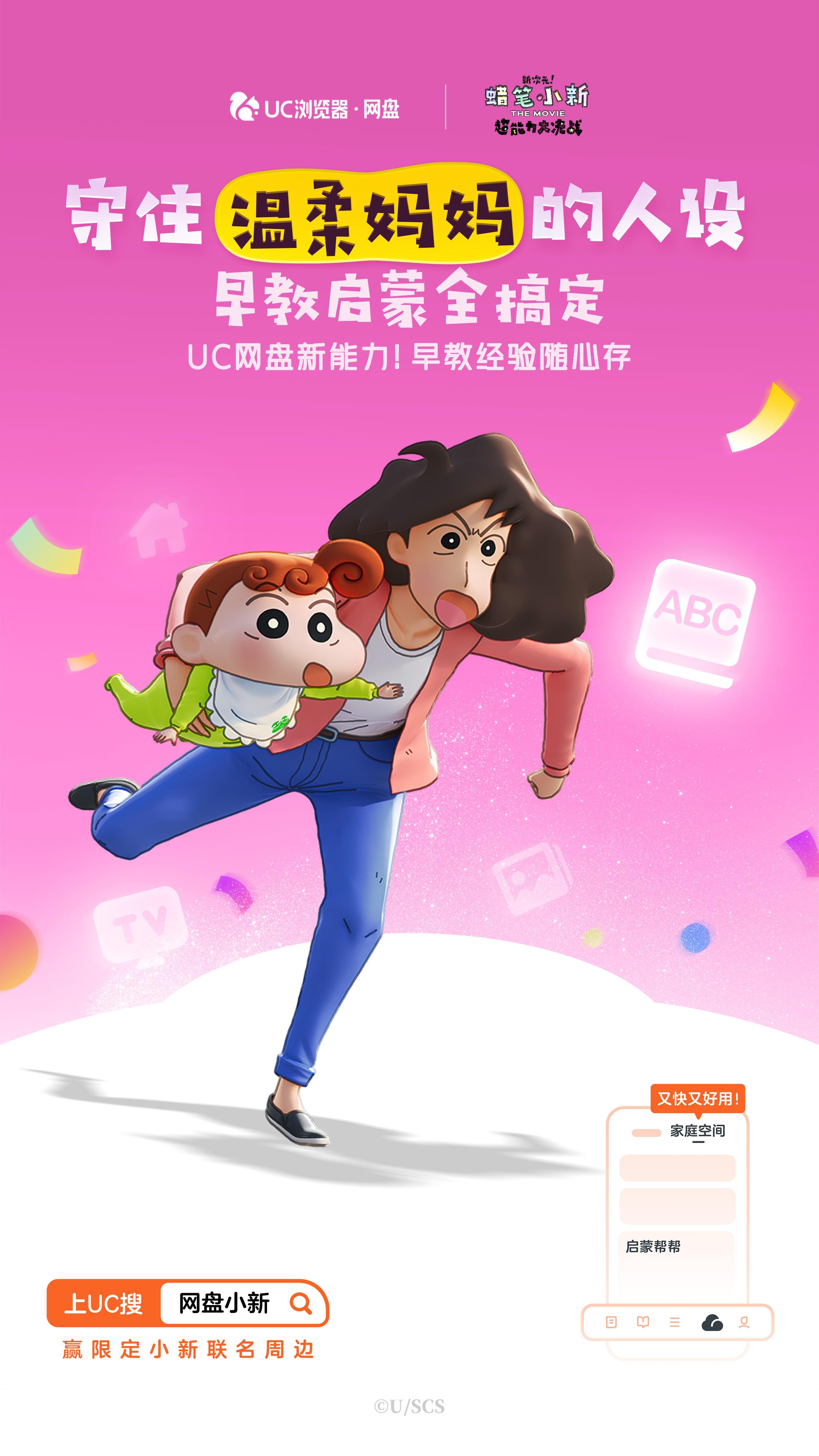 说到家庭日常,《蜡笔小新》是关于平凡又温馨的家庭日常生活的经典诠释。小新的搞怪、幽默、调皮的形象,也兼具了暖心、疗愈、善解人意的个性,与野原一家包括爸爸广志、妈妈美伢、妹妹小葵和宠物小白的全家人生活日常,都与UC网盘家庭空间中“家庭共享”的精神一致。
