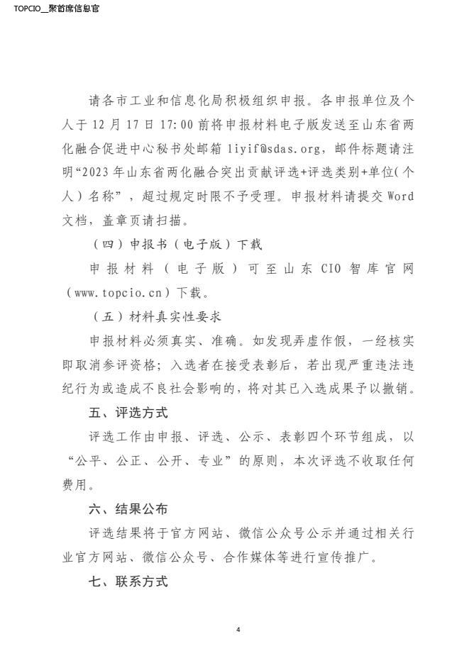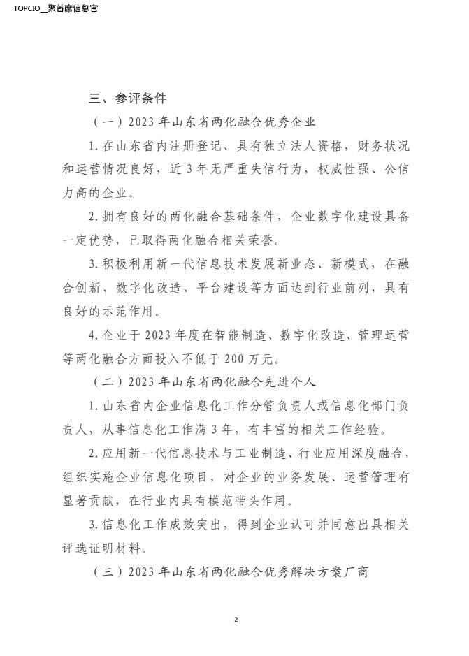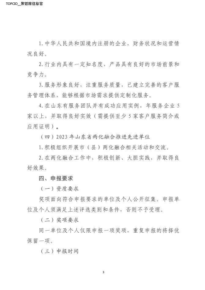 为贯彻落实《山东省制造业数字化转型提标行动方案(2023-2025年)》《山东省“十四五”数字强省建设规划》等有关工作部署, 加快企业数字化转型升级,促进工业化和信息化深度融合,省两化融合促进中心定于近期组织开展2023年山东省两化融合突出贡献奖项评选活动,现将有关事项通知如下。