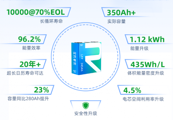 瑞浦兰钧问顶345Ah储能电芯采用独家专利技术“问顶技术”,融合了结构创新技术、工艺技术和装备技术及电化学固液界面技术等多项核心技术。在保持与280Ah电芯同一尺寸下,容量全面提升23%至350Ah以上,具备10000周长循环寿命和20年日历寿命,同时维持至少70%的末期电池寿命。能量效率提升至96.2%,减少了能量在转换过程中的损耗,降低7%的成本,能够为配套储能系统提升32%占地用率,减少10%以上碳排放,在为客户实现进一步降本增效的同时共同实现碳中和目标。