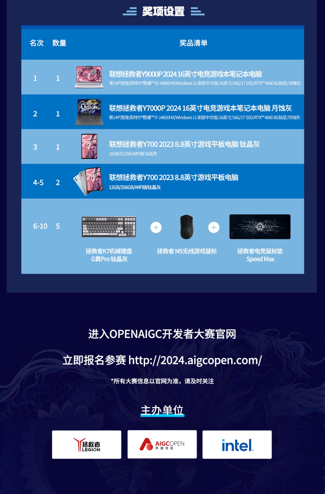 由联想拯救者、AIGC开放社区、英特尔联合主办的2024 OPENAIGC开发者大赛共设有创未来·AI应用赛、拯救姬AI创意赛、AI Agent极限挑战·现场赛三大赛道。涵盖AIGC、大模型、数字人等多个领域。