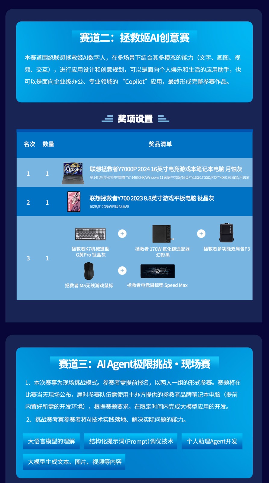 此赛道为现场挑战模式,参赛者需提前报名,以两人一组的形式参赛。赛题将在比赛当天现场公布,每个队伍根据赛题要求,使用主办方提供的拯救者笔记本电脑,提前预装好Agent智能体开发套件,在限定的时间内完成大模型应用的开发。