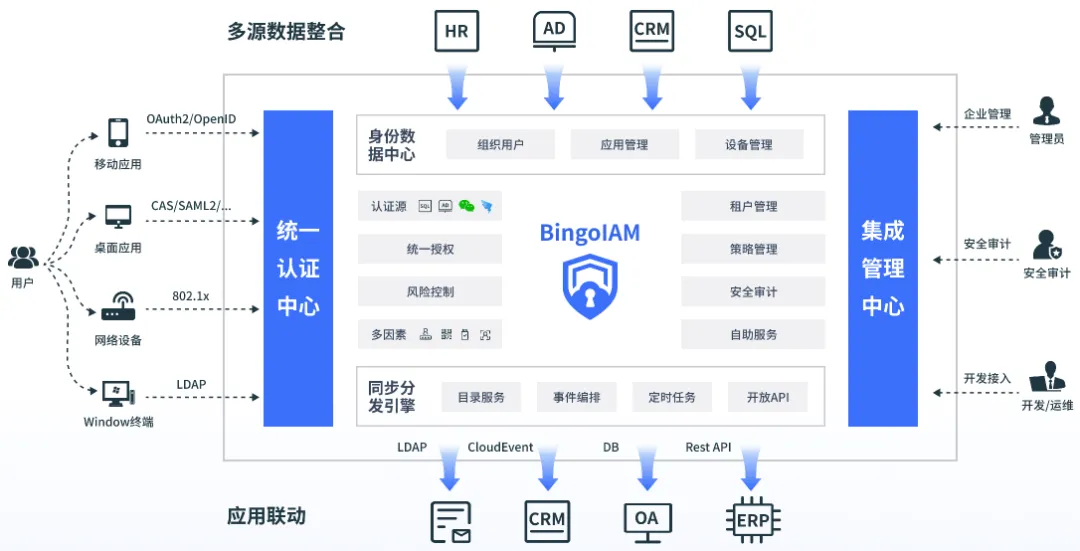 支持从多种身份源获取基础数据集中存储,自动化编排管控各类身份生命周期,并将身份信息同步分发至各系统,确保访问授权的一致性和完整性。