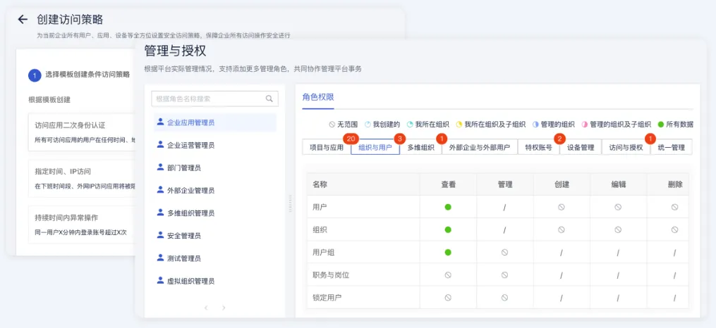 基于业务需求梳理公共角色,通过用户属性(如:部门、岗职、组别、角色等)集中、实时调控应用访问权限,有效优化资源管控、提高系统安全性和稳定性。