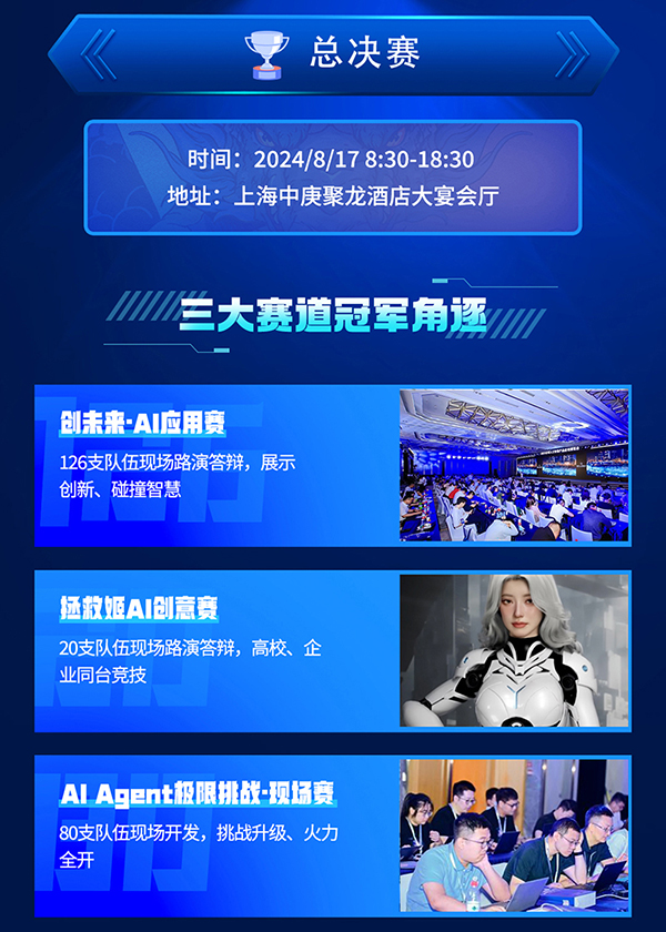 决赛现场设有三大赛道,“创未来·AI应用赛 ”和“拯救姬AI创意赛”的参赛者将在现场进行路演答辩来争夺最终排名,而“AI Agent极限挑战赛”将在现场揭题,参赛者在规定时间内完成项目开发,挑战升级,冠军争夺战一触即发!