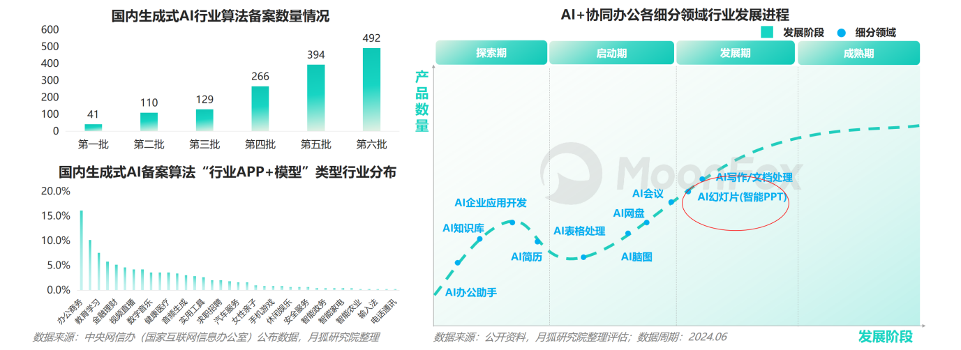 ● 当前,“人工智能+”成为生成式AI行业的重点任务。而AI+协同办公作为体现AI生产力、且行业玩家在早期集中布局的重要方向,无疑已成为当前整体行业中落地应用最为丰富的细分领域。在目前国内1400个生成式AI备案模型内中,办公协同领域的应用数量比例占比最高,AI+协同办公赛道已初具规模,并形成AI文档、AI表格、AI幻灯片、AI会议等细分产品赛道。其中,智能PPT作为一种具备信息查询、内容生成、模版定制编辑的新兴PPT制作工具,已形成一个独立的行业赛道,从产品数量角度来看,其已在AI协同办公一级行业中处于领先的市场发展期阶段