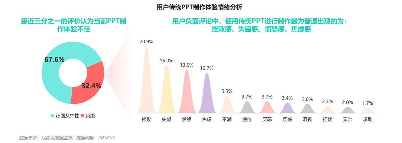 在PPT任务场景的广阔市场需求下,传统PPT工具却无法进一步满足用户要求,虽传统PPT工具已历经几十年发展,市场早已进入成熟阶段,用户培训成熟度也近乎达到巅峰。但用户在制作传统PPT过程中,仍有接近三成用户出现负面体验,在传统PPT工具学习门槛相对较高,人力制作几乎覆盖全流程的情况下,用户往往需要在时间紧、要求高的场景下工作,进而导致加班、疲惫等问题,最终形成了海量用户出现普遍性负面情绪