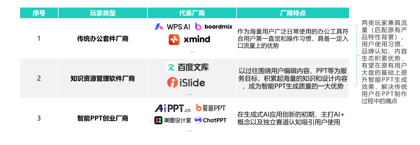 智能PPT市场在巨大的需求前景下,已吸引一批不同类型的玩家投入参与竞争。从参与玩家类型来看,不乏各类与PPT创作有关的上下游企业逐步向智能PPT赛道转型进入,也包括顺应生成式AI技术热潮所推出的创业企业玩家。当前,智能PPT赛道发展仍处于初步发展期,企业可以用户对AI技术的兴奋期进行发展,但长期来看,是否拥有入口便利性、内容资源积累,将可能是行业玩家的关键底层因素