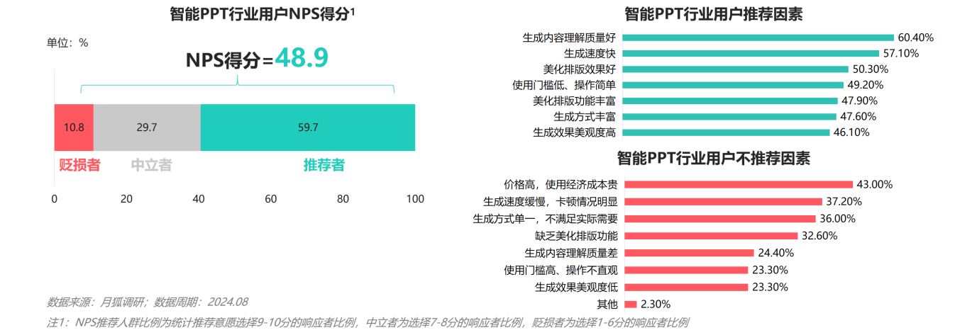 当前,行业用户对智能PPT产品推荐意愿明显,总体NPS得分达到了48.9(推荐人数比例),以传统效率工具行业的NPS基准为参考指标,智能PPT行业的NPS水平处于高分水平。其中,影响用户积极推荐的主要因素包括生成理解的内容质量,操作简单,美化效果,生成方式等,总体较为平均,这也显示出生成质量是用户关心的核心关键;另一方面,智能PPT普遍存在的高价格问题十分明显,成为主要贬损因素,这一因素明显限制了用户的使用推荐意愿,未来行业还需以创新营销等方式吸引用户