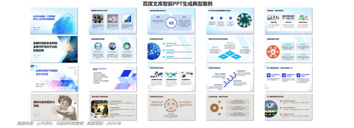 通过实际测试可发现,百度文库的智能PPT在内容理解和生成上已形成良好基础,百度文库已可理解多种行业的生成需求,如金融、汽车、数字化、教育等行业内容,智能PPT生成的文字、图片内容均与预设主题保持良好的关联性,可展示出完整清晰的结构逻辑,还能够根据具体话题,生成出更加精细化对应的内容结果(如以新能源汽车为主题,呈现出纯电乘用车、纯电商用车、插混等),已实现基础的可用性水准