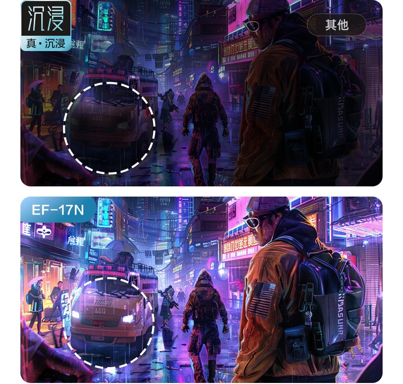 爱普生EF-17N采用3LCD全彩成像技术,输出的画面色彩更加真实明亮,色彩还原度更高,能够实现明暗色彩的丝滑衔接,精准呈现原画质感。同时,投影画面没有散斑、色散、彩虹现象*1,可带来更为舒适的观感,护眼效果也更为出色。而高纯度精准聚焦激光光源的应用,不仅确保色彩更加纯正饱满,还实现了低功耗、高稳定性以及更长的使用寿命等各方面的优势。同时,爱普生EF-17N内置0.62英寸大尺寸芯片,通光量更大,画质也更加清晰明亮,细节纤毫毕现。