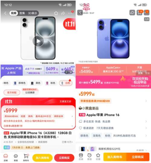 据Apple Store官方旗舰店公布的优惠显示,天猫买iPhone 16系列至高优惠1600元,惊喜券优惠500元,再加以旧换新至高补贴1100元。京东在同等优惠的基础上,多赠送1年期AppleCare+服务,价值高达649元。需要注意的是,1年期AppleCare+仅限iPhone 16、iPhone 16 Plus可用,在京东购买iPhone 16 Pro和iPhone 16 Pro Max,仅+99元就能得价值899元的1年期AppleCare+。