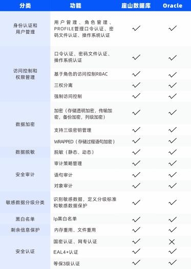 崖山数据库在身份认证和用户管理、访问控制和权限管理、数据加密、数据脱敏、安全审计、备份恢复、分类分级、剩余信息保护等方面全面对标 Oracle 安全架构设计,在国密支持、安全漏洞修复等方面表现更优。