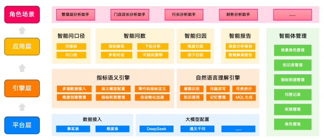 一是大模型 Agent,能够准确识别用户查询目标,精准理解业务意图,生成指标语义查询 MQL,并负责将数据结果转化为易于理解的洞察语言和图表报告;