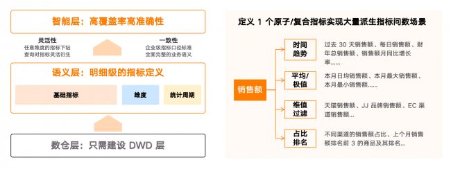 数据完整:基于明细层数据模型进行语义抽象,突破分析维度和数据粒度的固化,覆盖完整的分析场景;