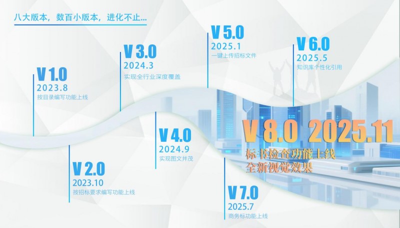 截至2025年11月,文兜智写已经完成了8个版本的迭代升级,最快时仅1分钟就能够生成50万字的文件内容。它已不仅是一个工具,也让投标变得更简单、更精准,真正实现了从效率提升到中标率提升的价值闭环。这正是文兜始终如一的承诺:想中标,找文兜。