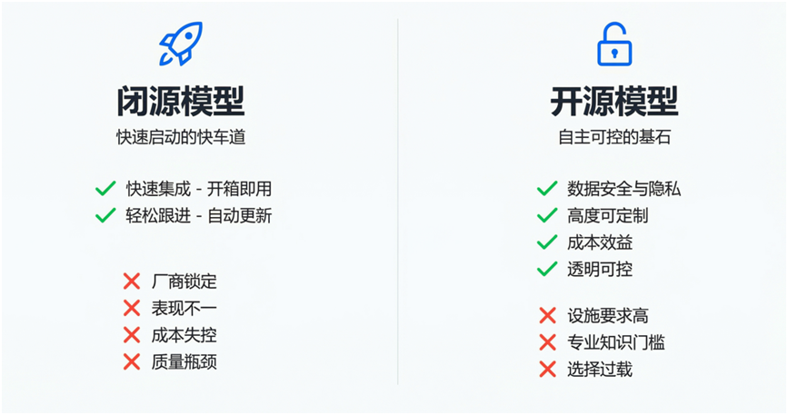 模型选型的第一站,是开源与闭源(专有模型)的路线选择。两者各有优劣,代表了两种截然不同的 AI 构建哲学。