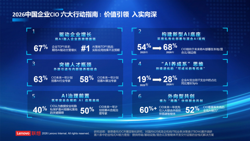 “这十个趋势共同指向了一个方向,整个行业从+AI 正在进入到AI+阶段。”阿木指出。立足这一行业背景,联想面向全行业620家政企CIO做了深入调研并发布了《指南》,结合这一报告,阿木明确指出2026年六大企业AI行动方向,系统回应了CIO们在转型进程中最关切的战略、能力与生态问题。