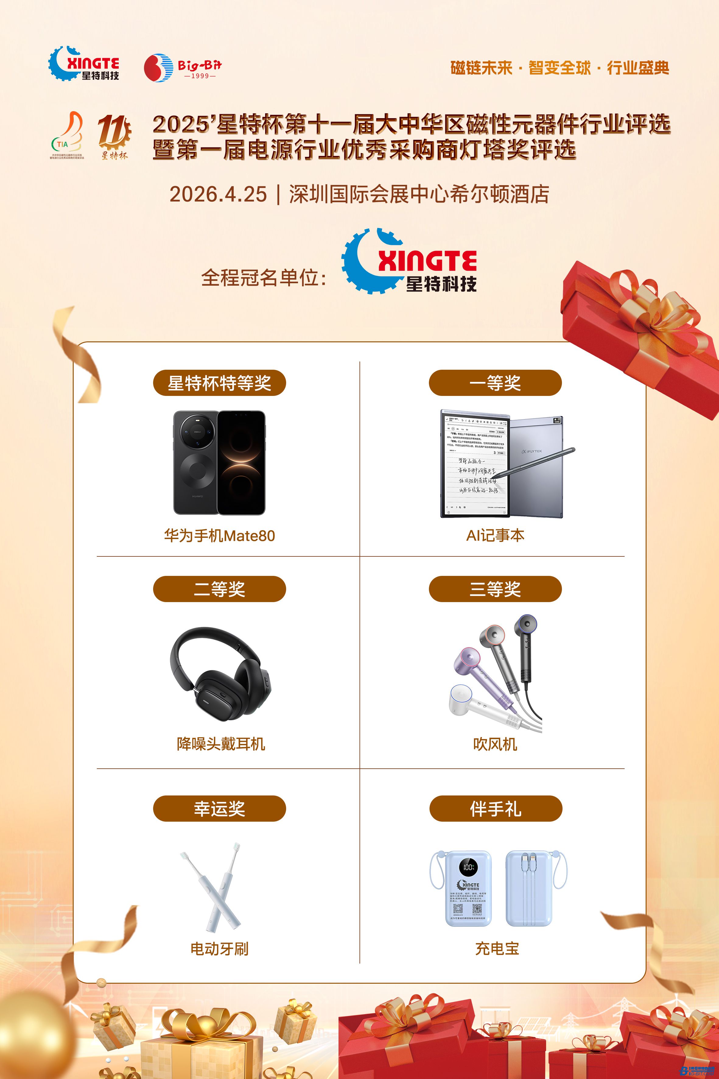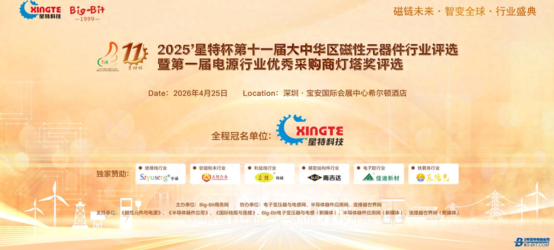 2026 年 4 月 25 日,星特杯第十一届大中华区磁性元器件行业评选暨第一届电源行业优秀采购商灯塔奖颁奖盛典,将在深圳国际会展中心希尔顿酒店盛大启幕。届时两大重磅奖项同台揭晓,以权威认证为行业标杆加冕。