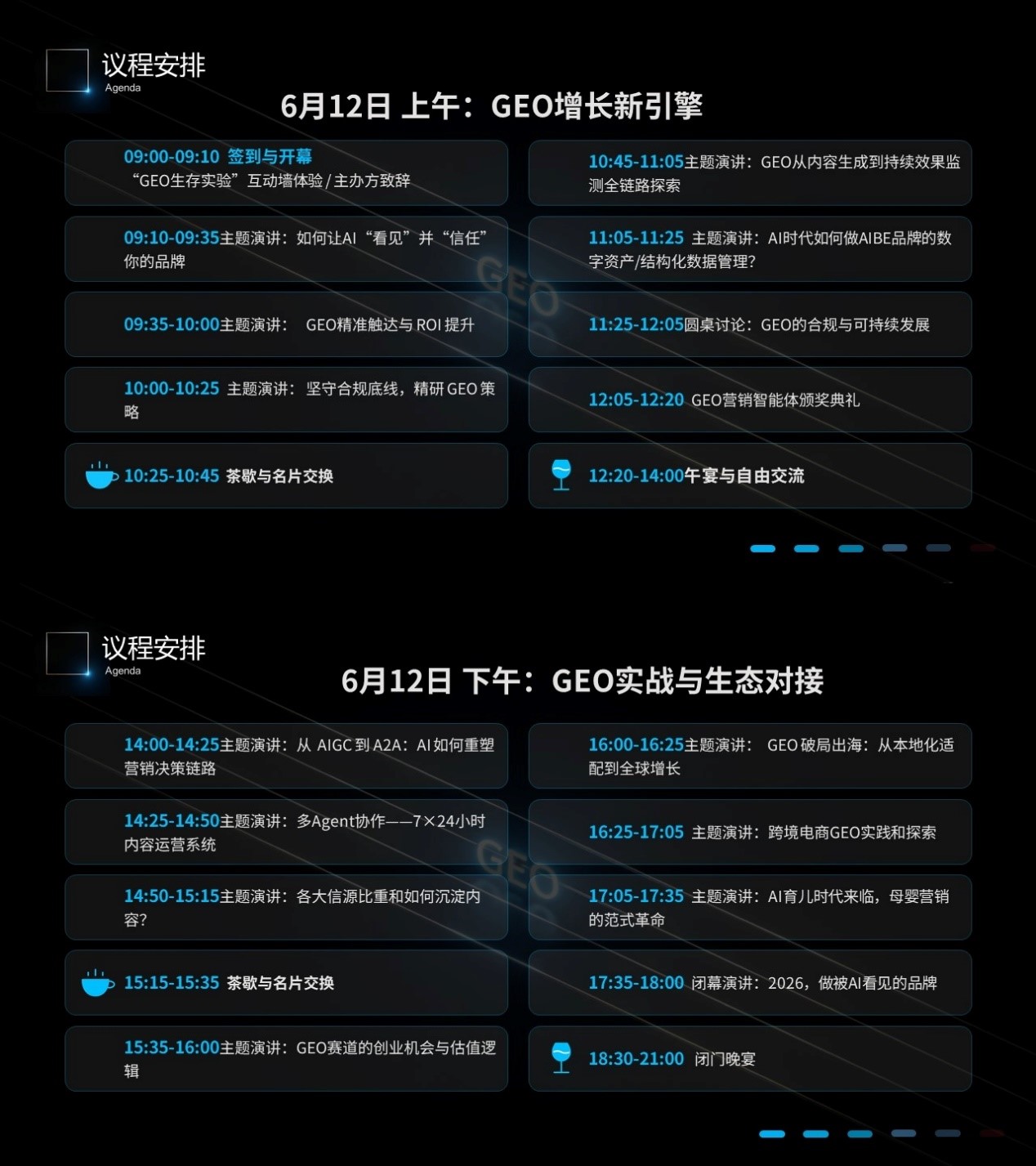 下午・GEO 实战与生态对接:深度探讨 AIGC 到 A2A 的营销链路重塑、多 Agent 协作运营、内容沉淀方法、跨境 GEO 本地化适配、母婴等垂直领域 GEO 范式革新,同时解析 GEO 赛道创业与投资逻辑,覆盖从策略到落地、从国内到海外的全场景需求。
