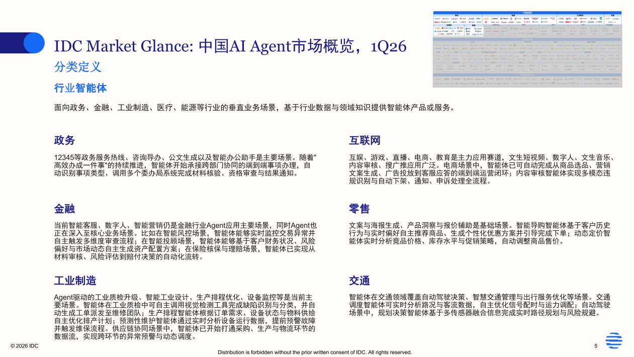 当前智能体市场厂商众多,但能力与落地经验参差不齐,企业难以甄别。IDC 通过深度调研,推出《中国AI Agent市场概览》报告,预先筛选出了覆盖不同行业和业务场景中,满足评估要求的可靠智能体产品及解决方案供应商,供企业参考选择。