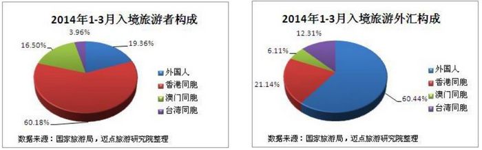 从以上数据来看,2014年1季度虽然各地入境旅游者在人数上都有不同幅度的下降,但是就旅游外汇收入来看,除却香港同胞的降幅,其他三方都有一定程度的上升,其中外国人上升的幅度最大。将两张表对比来看,外国人与台湾同胞虽然在人数上并没有占据很大的比例,但是在旅游外汇收入中却是力压另外两方。