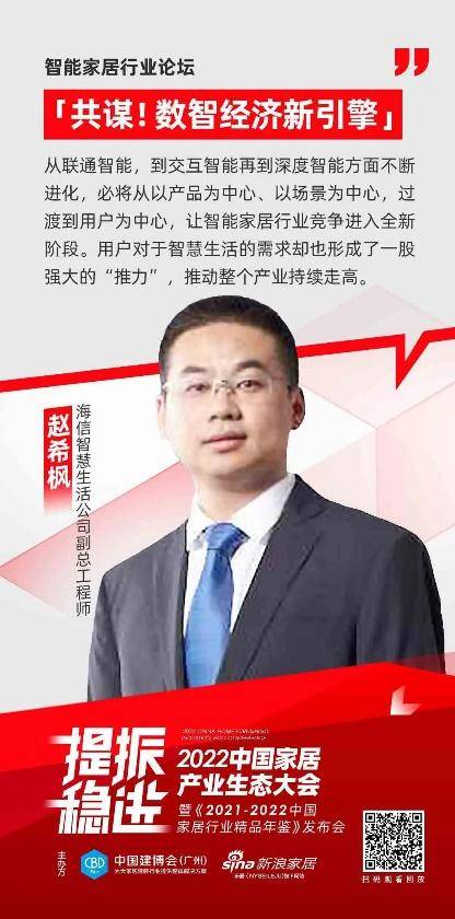 7月7日,在2022中国家居生态大会《共谋!数智经济新引擎》智能家居行业论坛中,海信智慧生活公司副总工程师赵希枫作为行业代表做了发言。