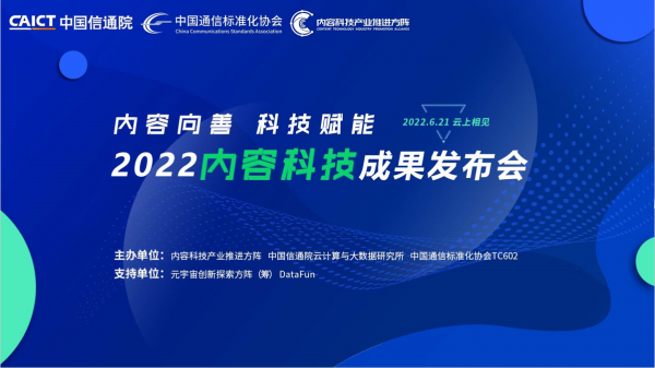 6月21日,由中国信通院云计算与大数据研究所、内容科技产业推进方阵、中国通信标准化协会TC602联合主办的“2022内容科技成果发布会”在线上顺