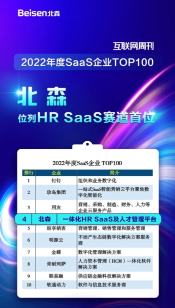 近日,由德本咨询、eNet研究院、《互联网周刊》联合发布的“2022年度SaaS企业TOP100”排名正式对外公布。一体化HR SaaS及人才管理平台——北森